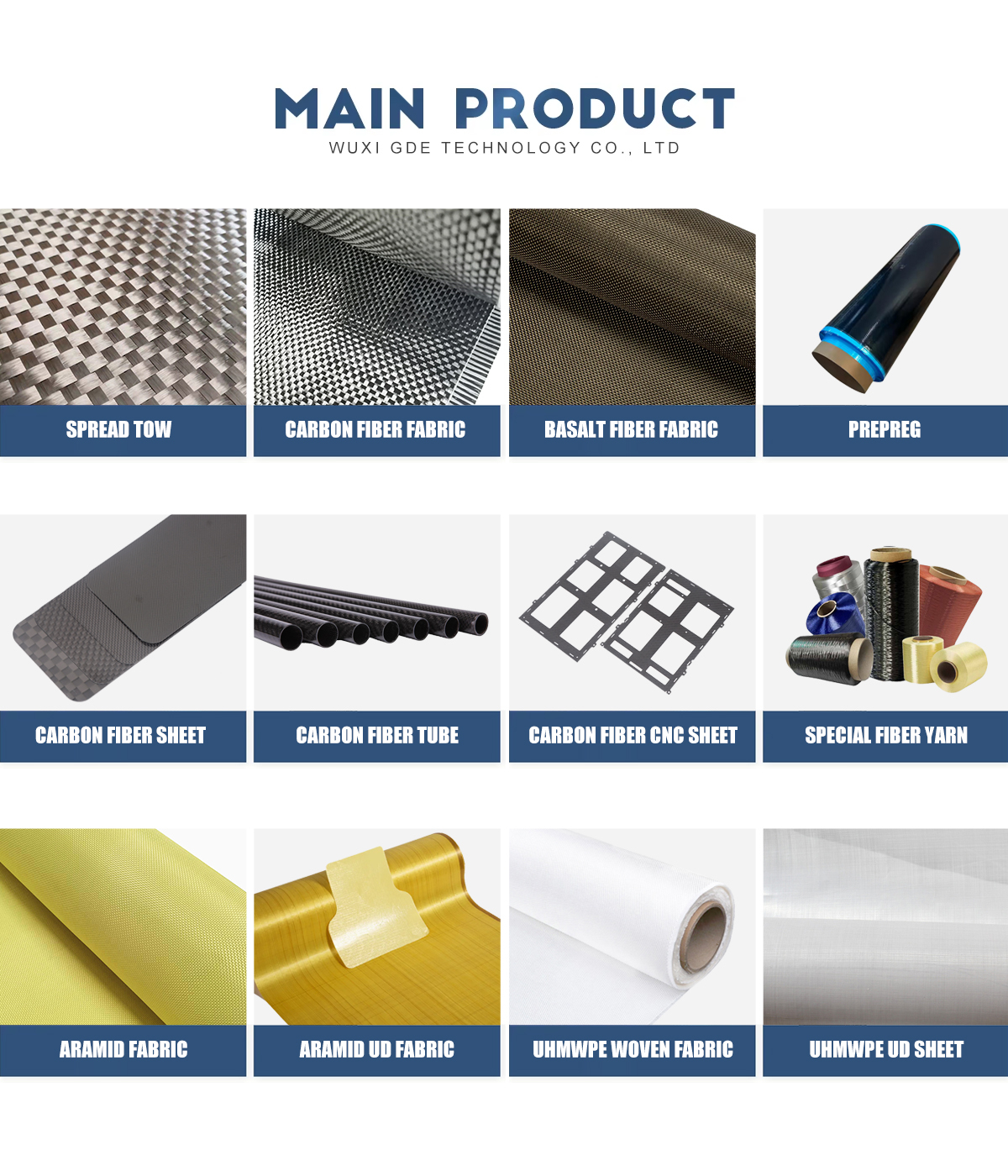 Productos principales:Lámina de fibra de carbono, tela de fibra de carbono, tela Kevlar, tubo de fibra de carbono, tela UHMWPE